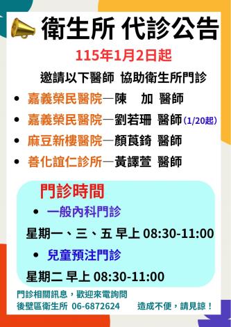 📣 後壁區衛生所代診公告 自 115年1月2日起,特別邀請 嘉義榮民醫院、麻豆新樓醫院、在地診所 專業醫師到所代診,
